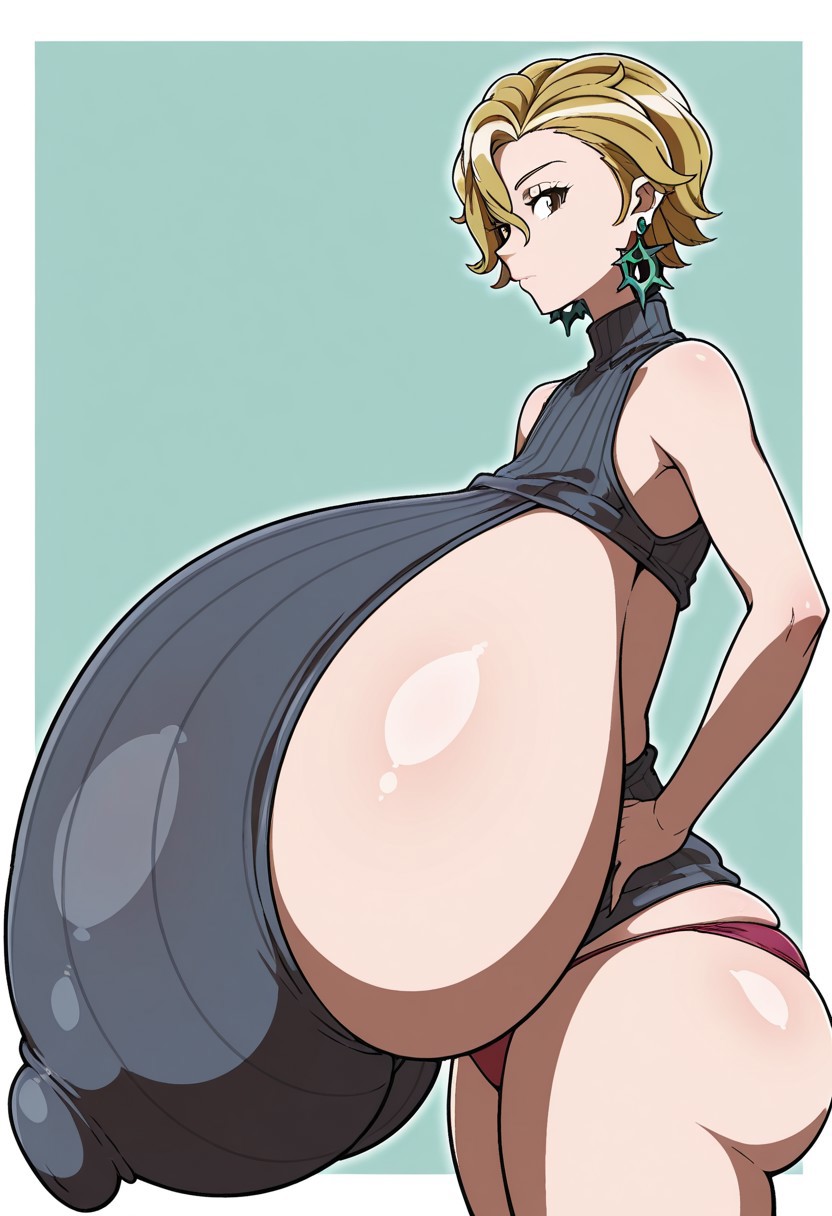 브라이어, 금발, 단발, 갈색 눈, 귀걸이, 보석, 리브 니트, 팔 없음, 속옷, 거대한 가슴, 엄청난 엉덩이