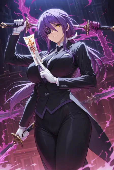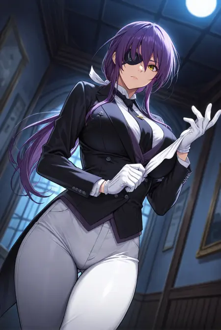 purple hair , ( one eye covered ) , eyepatch , yellow eyes ;