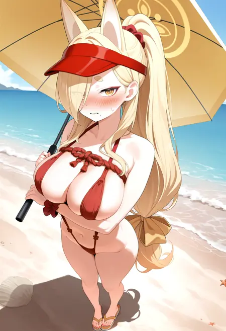 kuwak4h0, 狐耳, 金发, 极长发, 低扎长发, 橙色发带, 头饰, 额外耳朵, 黄色光晕, 深黄色眼睛, 发丝遮住一只眼睛, 浓密短眉, 红色眼影, 嘴下方有痣, 大胸,