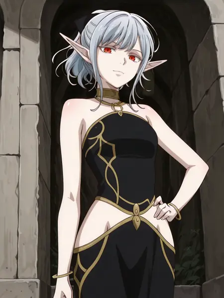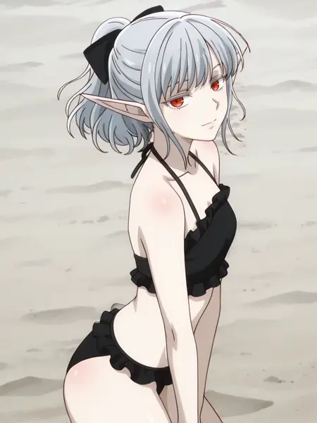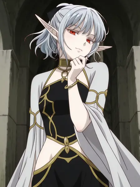 atou, long pointy ears,short hair, silver hair, bangs, red eyes,elf, anime screenshot, pale skin, short ponytail,small breasts
