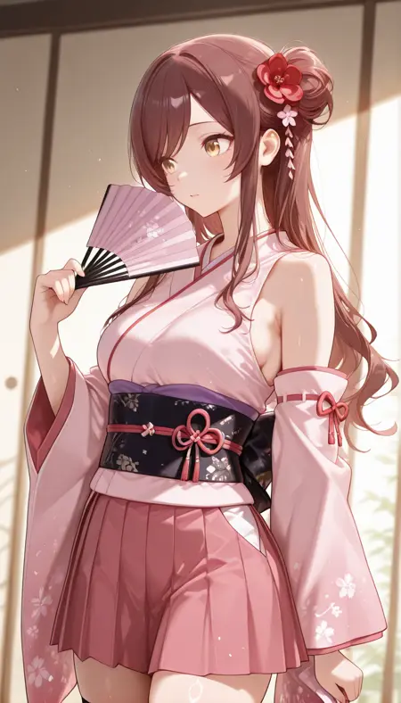 4.裙子,长袖,头饰,大腿袜,手持,露肩,花朵,大腿,百褶裙,可拆卸袖子,日本服饰,无袖,黑色大腿袜,发饰花,宽袖,腋下,和服,发髻,绝对领域,腰带,花卉图案,腰带,红花,折扇,粉红色裙子,折纸扇,手持扇子,粉红色和服,纸扇,无袖和服,发簪,粉红色袖子,和服裙,迷你裙,单发髻,丝带镶边