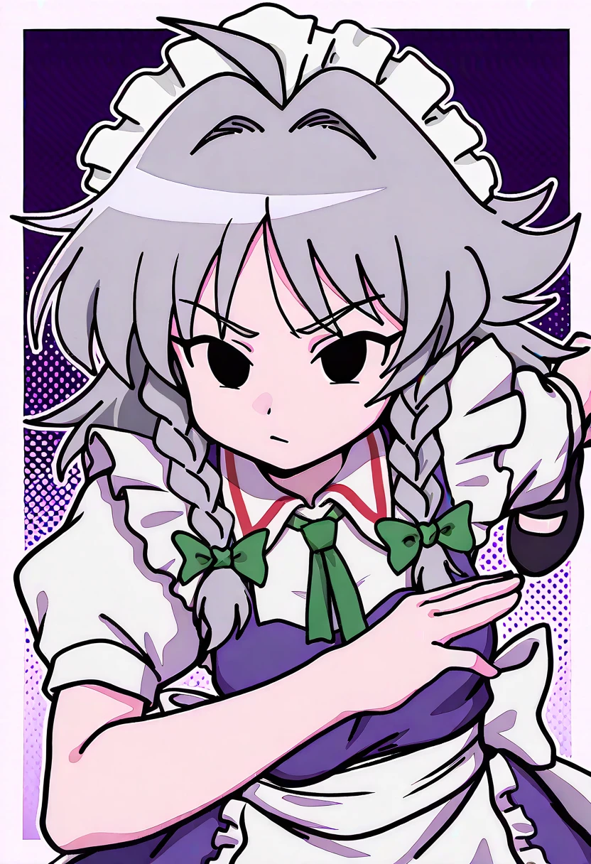 Sakuya4IzayoiTHMP, 1girl, silver-gray layered hair with a braided strand adorned with green hair bows, purple maid-inspired dress, white shirt, white apron, black shoes, black eyes, no sclera,