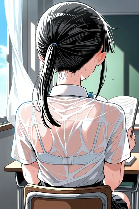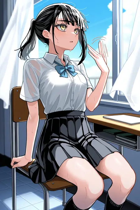 학교: 흰 셔츠, 칼라 셔츠, 반소매, 파란 리본 넥타이, 검은 주름치마, 중간 길이 치마, 검은 양말,