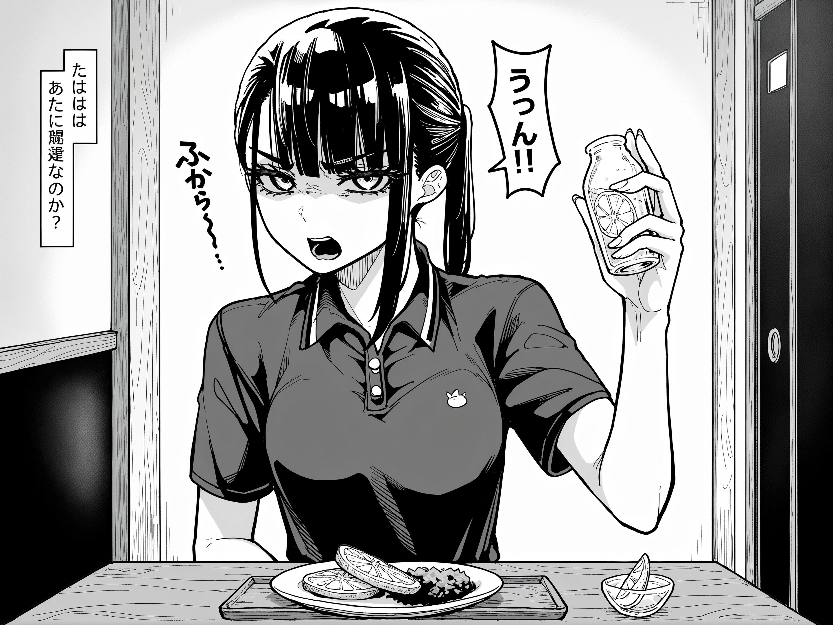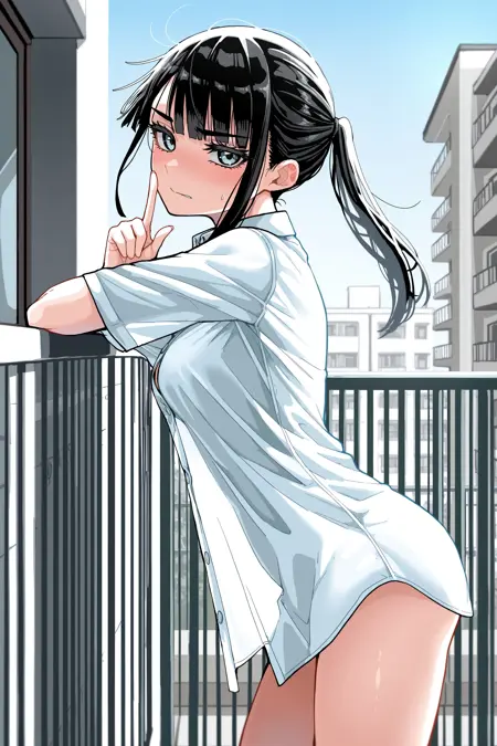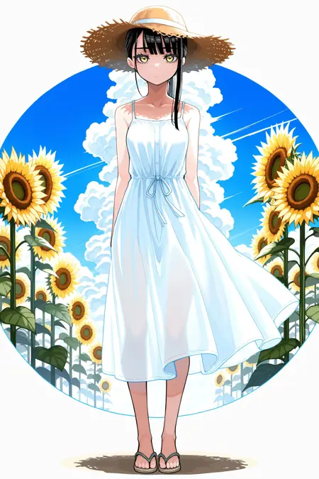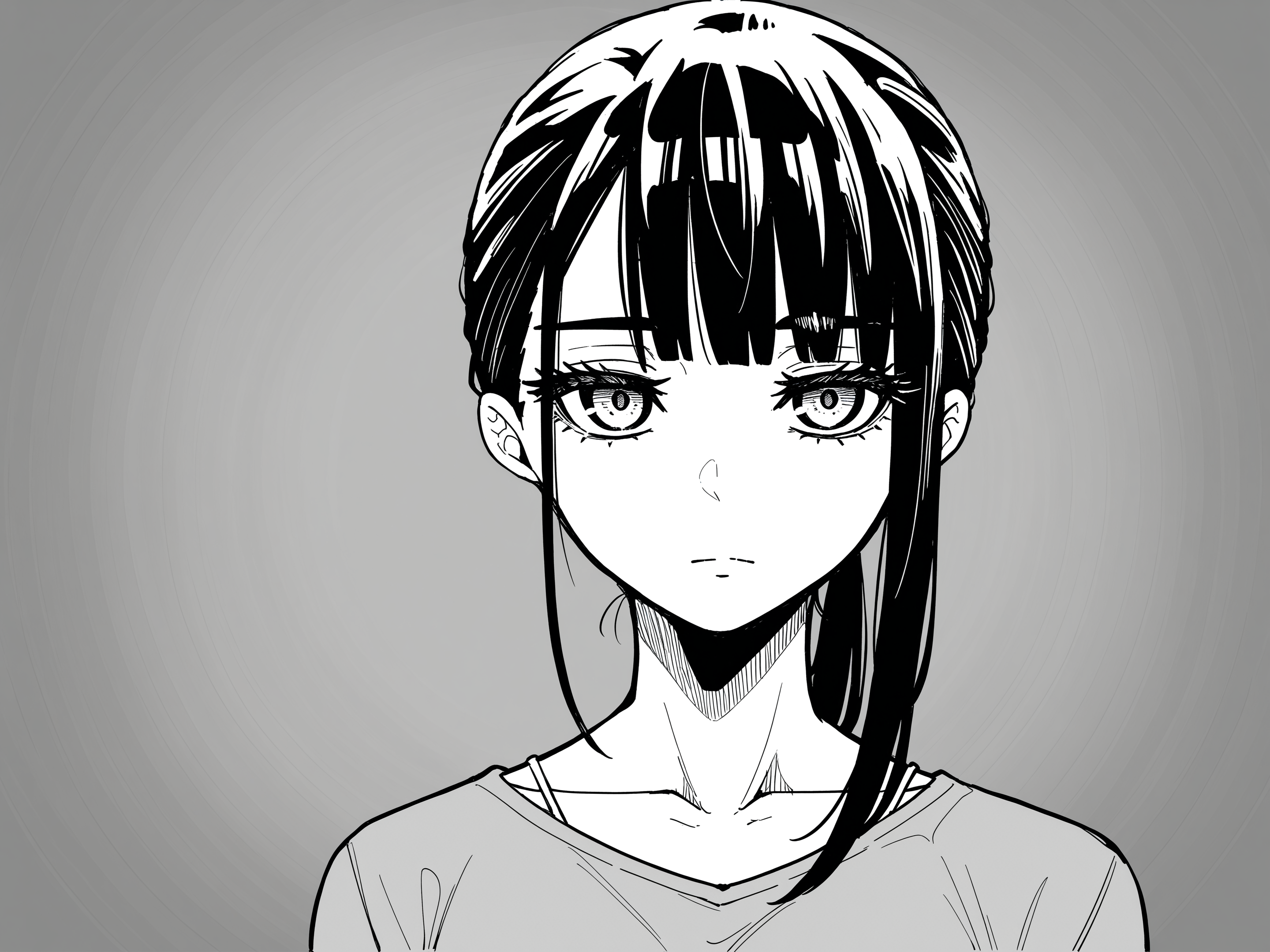 긴 머리, 직선 앞머리, 측면 머리카락, 링 모양 눈, 중간 크기 가슴,