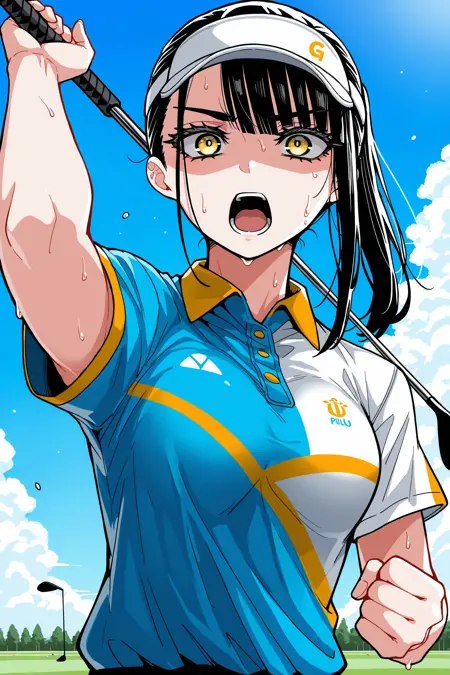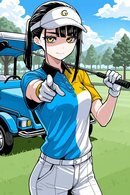 골프: 비저 캡, 폴로 셔츠, 다색 셔츠, 반소매, 흰 장갑, 바지, 검은 양말, 스니커즈,
