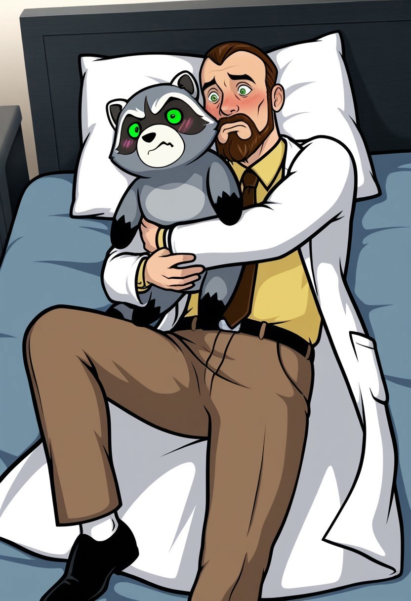 1man,solo,male focus,Dr.Krieger,short hair,brown hair,beard,green eyes,mature,slightly muscular,yellow collared shirt,brown pants,black shoes,black belt,brown necktie,labcoat