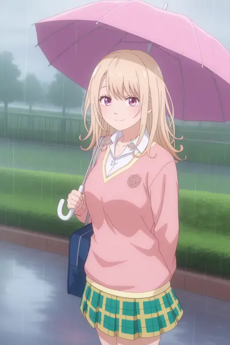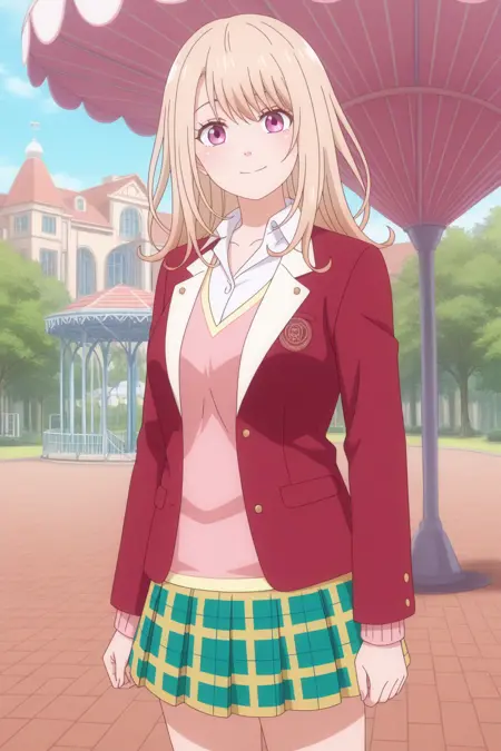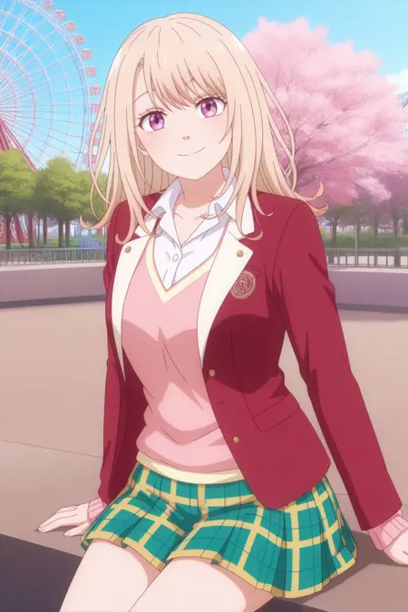 aamona, purple eyes, blonde hair, long hair, monablazer, open collar, white dress shirt, pink sweater, red blazer, green skirt, plaid skirt, pleated skirt, anime coloring,