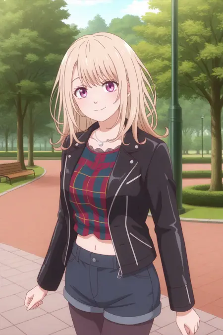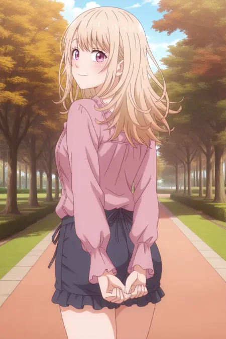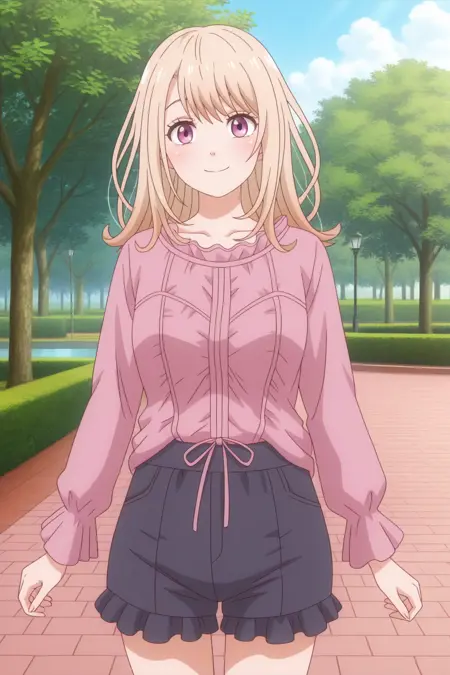 aamona, purple eyes, blonde hair, monac1, pink shirt, long sleeves, black shorts, frilled shorts, anime coloring,