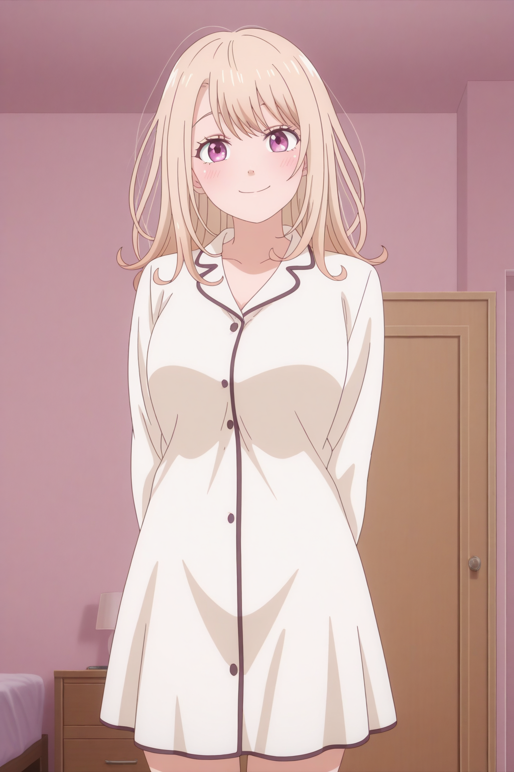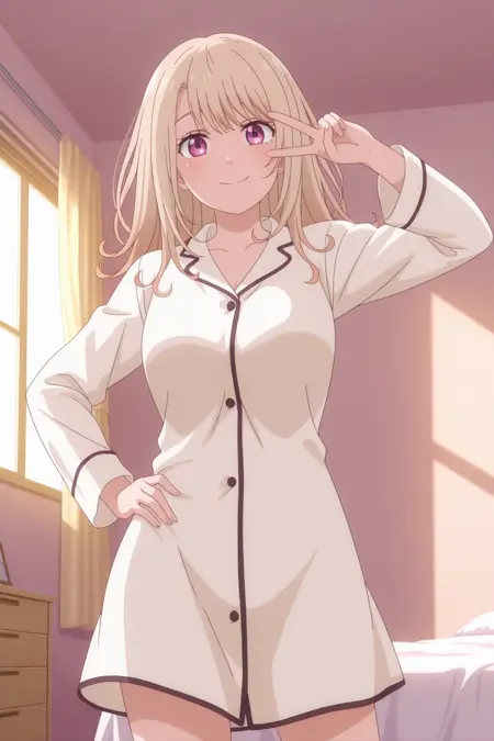 aamona, purple eyes, blonde hair, monasleep, pajamas, white dress, white pajamas, anime coloring,