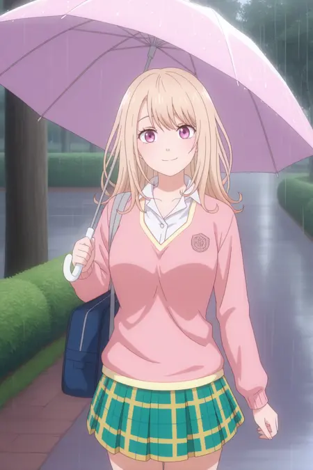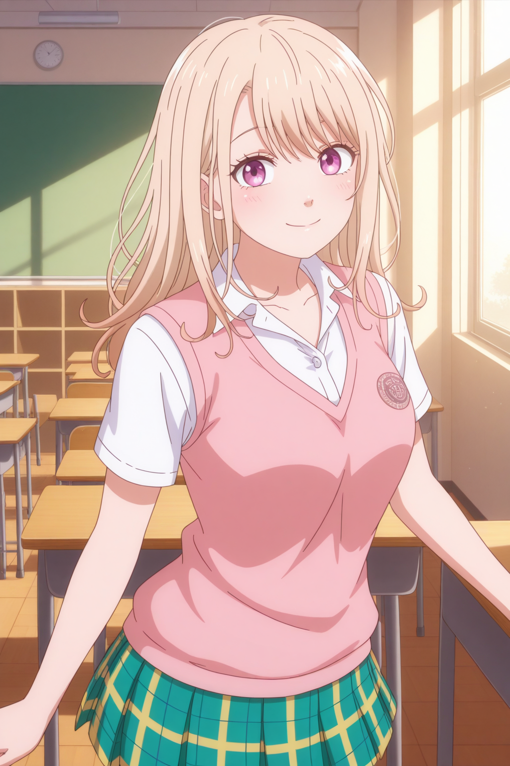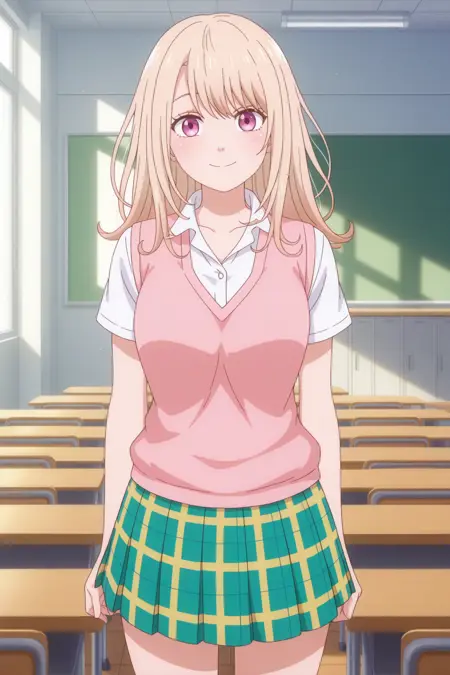aamona, purple eyes, blonde hair, long hair, monavest, open collar, white dress shirt, pink sweater vest, short sleeves, green skirt, plaid skirt, pleated skirt, anime coloring,