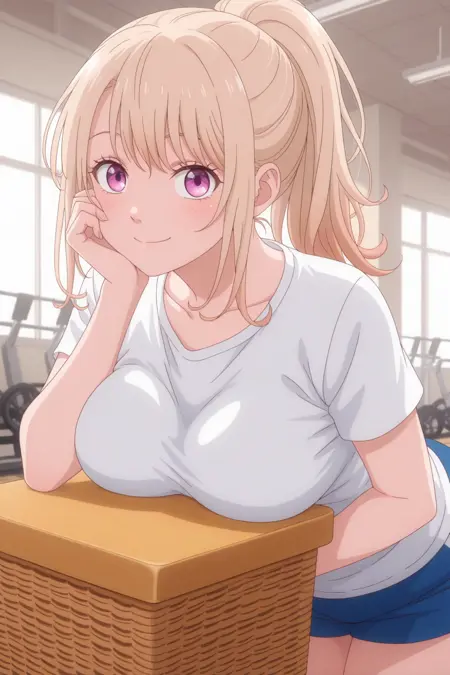 aamona, purple eyes, blonde hair, ponytail, monagym, gym uniform, gym shirt, white shirt, short sleeves, gym shorts, blue shorts, anime coloring,