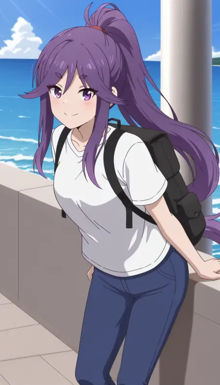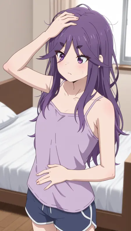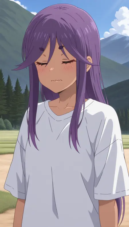 Default: koyomi hasunuma, purple hair, ponytail, sidelocks, thick eyebrows, short eyebrows