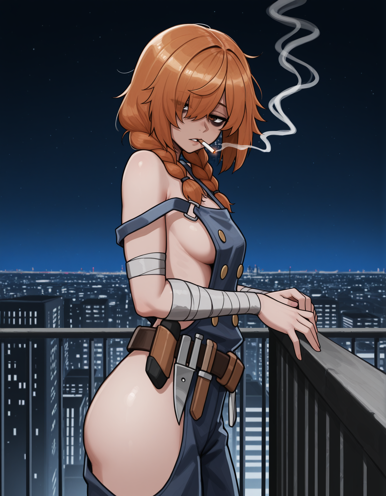 dutchg、オレンジ色の髪、ツインバギー、茶色の目、目の下のクマ、ヘルメット、中くらいの胸、青色のオーバーオール、ヒップベンチ、胸のサラシ、腕の包帯、ベルト、ガントレット、ブーツ、ドリル