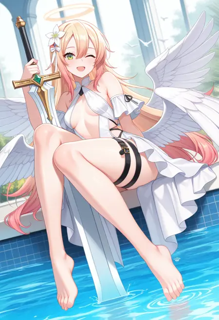 barefoot,feathered wings,halo,white wings,angel wings,feet,toes,low wings,toenails,thigh strap,legs,white dress,multiple wings,revealing clothes,bare shoulders,navel,