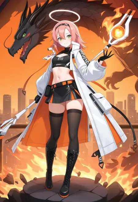 belt pouch,black thighhighs,crop top,open coat,knee boots,midriff,open clothes,navel,black gloves,lace-up boots,white coat,black skirt,miniskirt,cross-laced footwear,black shirt,stomach,black footwear,long sleeves,clothing cutout,cleavage cutout,turtleneck,torn coat,torn clothes,thighs,high collar,open jacket,thighhighs under boots,white jacket,two-tone coat,sleeveless,clothes writing,id card,zettai ryouiki,