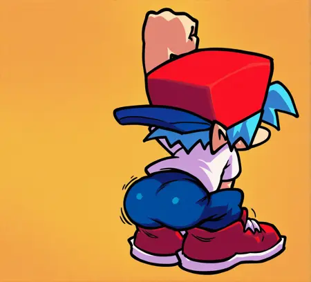 Boyfriend_FNF, black eyes, light skin, cyan hair, spiky hair, backward pink-red cap with a blue brim, magenta-white short-sleeved T-shirt with a red prohibition sign, blue pants, baggy pants, red sneakers with magenta white shoelaces
