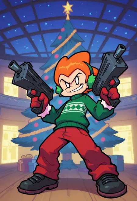 green sweater, black shoes, red gloves with white cuffs, red pants, green and white earmuffs, Christmas lights around gun