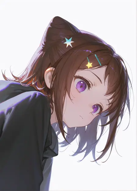 户山香澄 戸山 香澄 toyama kasumi, bang dream!,purple eyes, brown hair, cone hair bun, medium hair, short hair, star hair ornament,