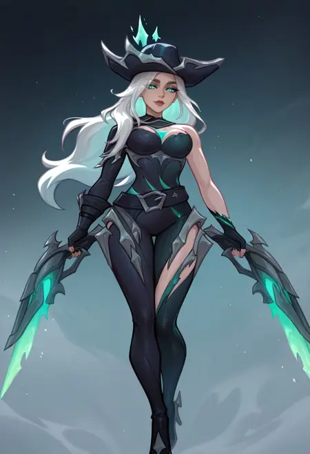 タグ:ruinedmf、ロングヘア、白髪、海賊帽、黒い頭部装備、緑の目、発光する目、非対称な服、片方の裸の肩、大きな胸、黒い指なし手袋、片袖、黒いベルト、黒いズボン、ハイヒール、ハイヒールブーツ