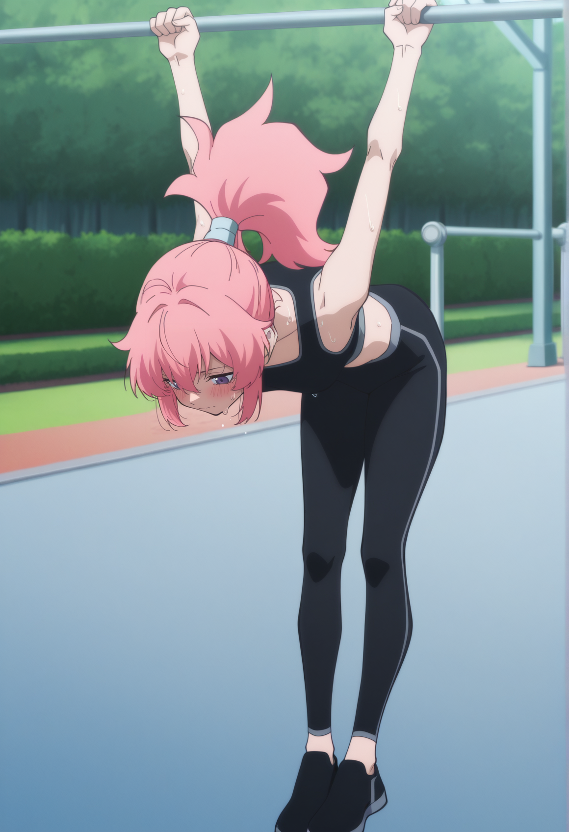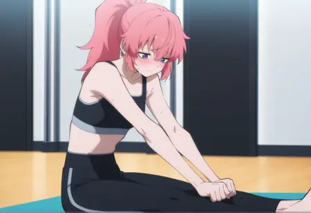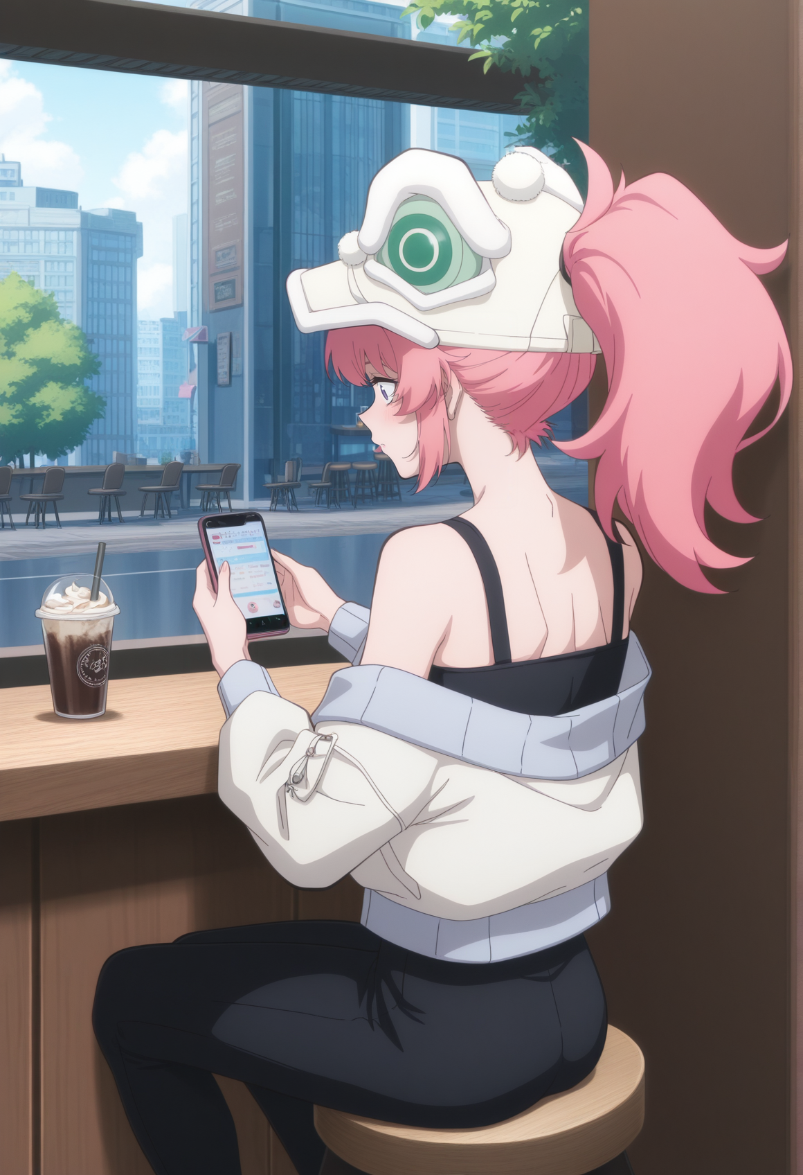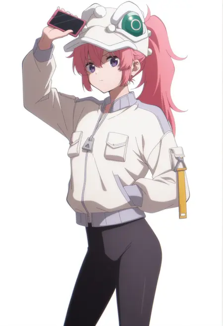 pink hair, purple eyes, animal hat, ponytail, jacket, black leggings