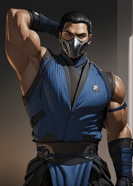 subzero, black hair, mask, gloves, muscular, ninja, vest, perfect eyes,