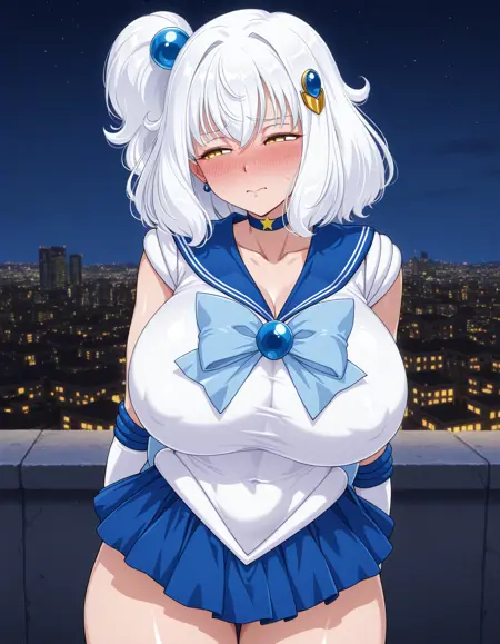 shiroeBG, white hair, medium hair, side ponytail, hair ornament, yellow eyes, collarbone, white sweater, pink apron, blue skirt, long skirt