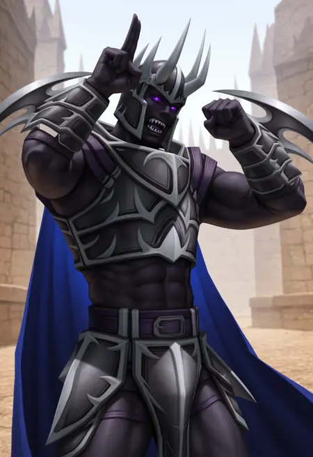 armor, chestplate, bladed bracers, belt, armored loincloth, tassets, spiked helmet, blue cape