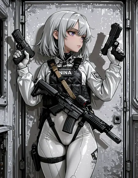 1girl, rifle_pistol_transition, holding pistol, rifle on body, assault rifle, sling