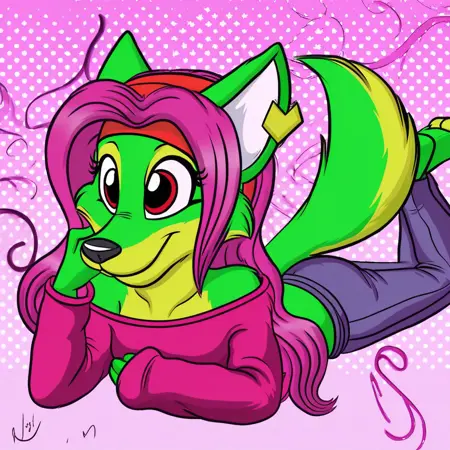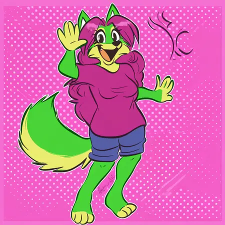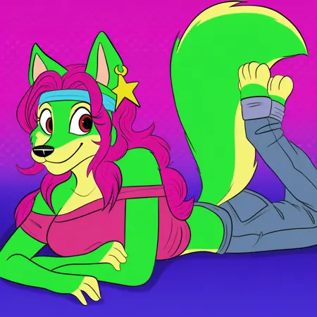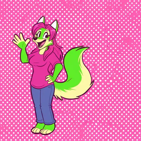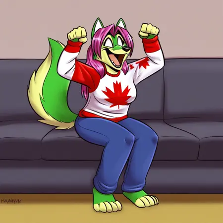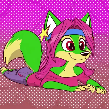 | 训练词汇 | labbeh_peaches, solo, 1girl, fox, furry female, anthro, magenta hair, long hair, dark magenta shirt, blue jeans, fox tail, green fur已复制! headband, off-shoulder_shirt, star earring, short gray jeans,已复制! white sweater, canada flag pattern on clothes,已复制! |