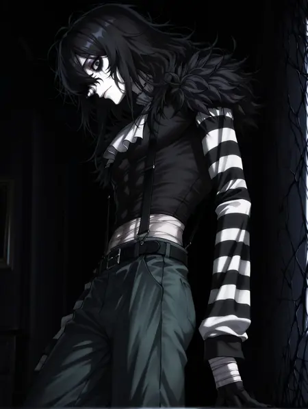 복장 프롬프트: striped, suspenders, bandages, gloves, pants, white ascot, striped sleeves, belt, shirt, boots