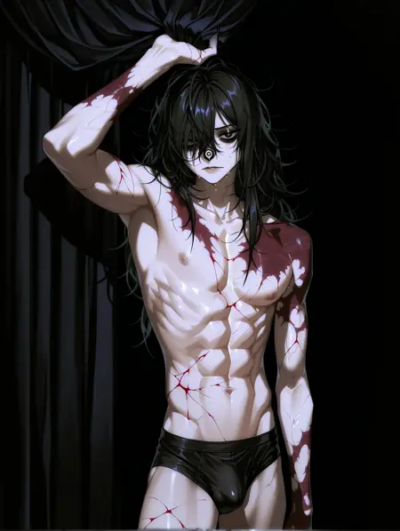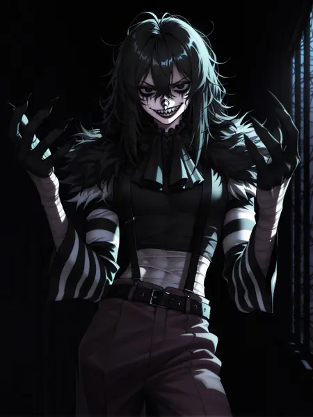 잭 프롬프트: 1boy, male, black hair, long hair, messy hair, colored skin, claws, hair between eyes, makeup, black eyes, sharp fingernails