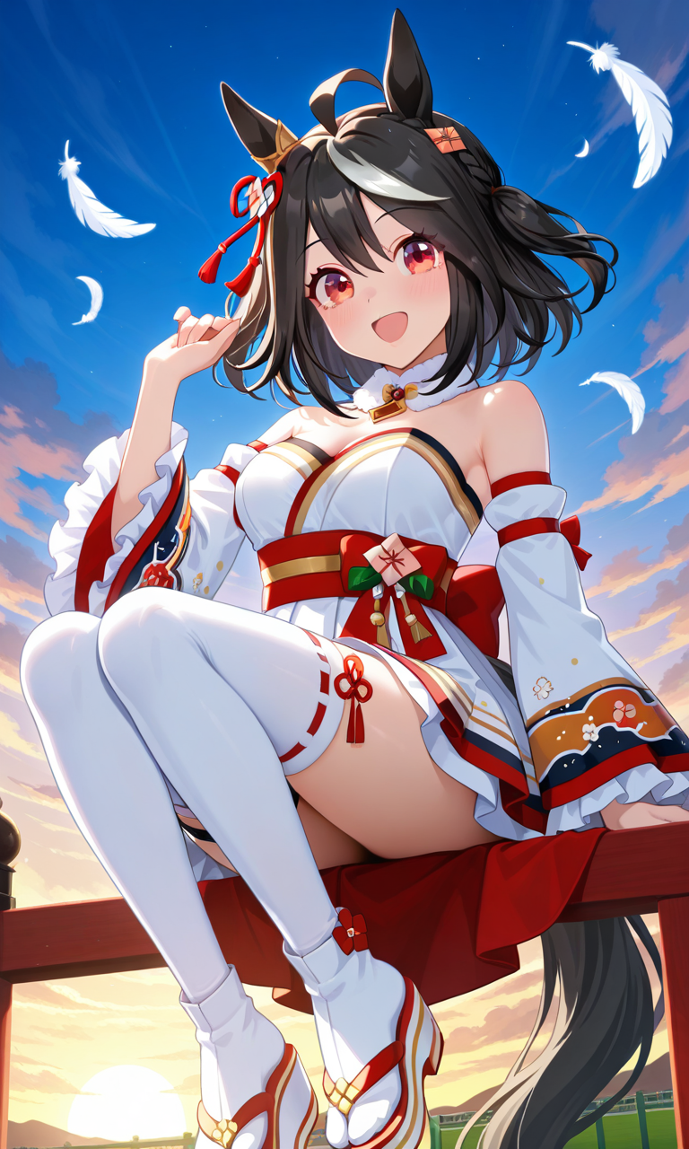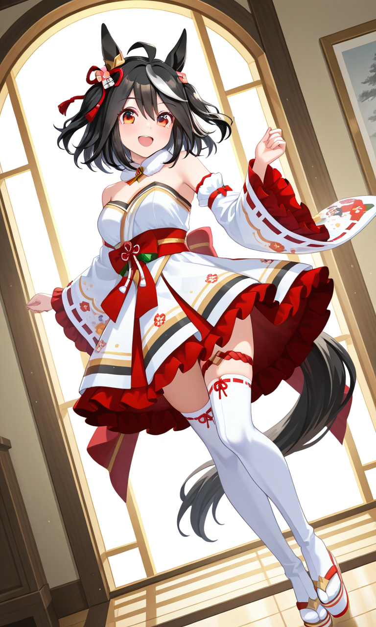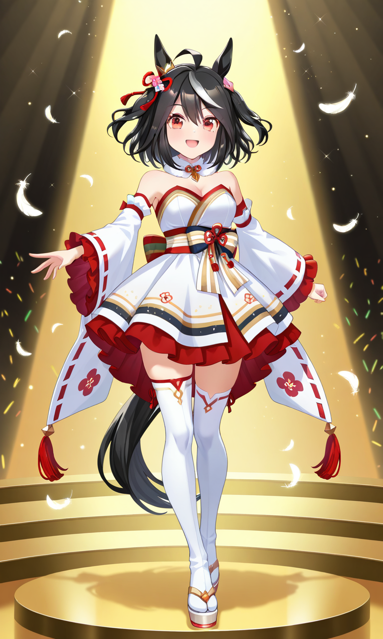 kitasan black \(umamusume\) white hair,horse girl,black hair,two-tone hair,multicolored hair,medium hair,hair between eyes,ahoge,short hair,streaked hair,red eyes,orange eyes,hair ornament, horse ears, horse tail, white frilled detached wide sleeves,cleavage,bare shoulders, medium hair,lokobo, jubilant star auspicious crane, white tabi, white fur collar, armlet, parallel thigh strap, white strapless japanese dress, white shorts,shorts under dress ear ornament