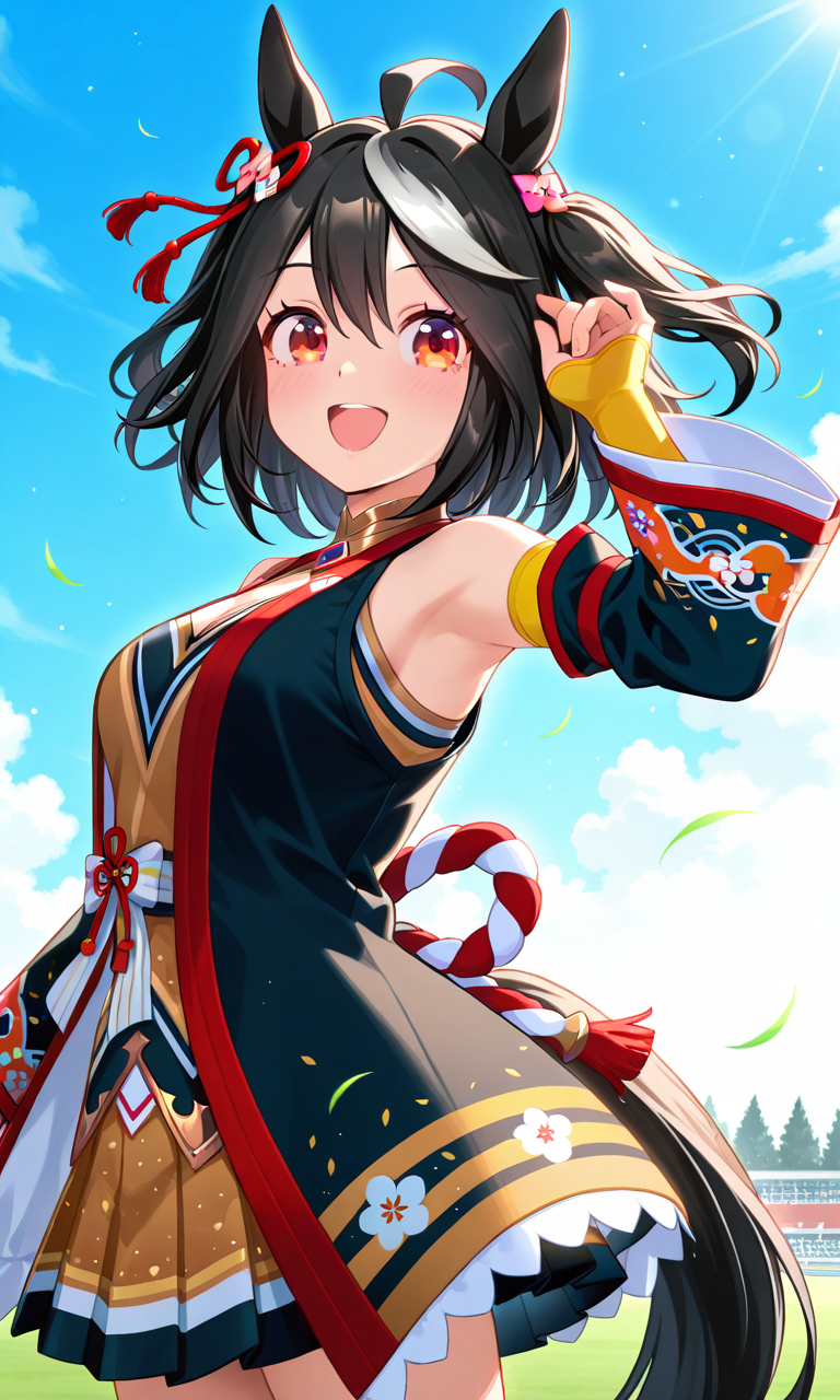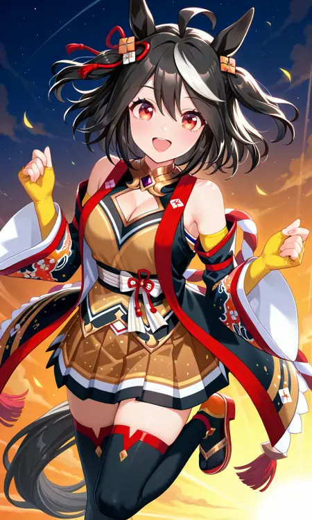 kitasan black \(umamusume\) white hair,horse girl,black hair,two-tone hair,multicolored hair,medium hair,hair between eyes,ahoge,short hair,streaked hair,red eyes,orange eyes,hair ornament, horse ears, black thighhighs, cleavage cutout, cleavage, clothing cutout, bare shoulders, horse tail, hair ornament, two side up, chanchanko jacket, detached wide sleeves, multicolored skirt, yellow high-neck crop shirt, low back kouhaku nawa, red shoes, yellow arm covers, waist white bow