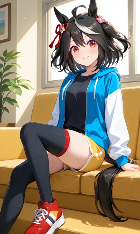 kitasan black \(umamusume\) horse ears,horse tail,white hair,horse girl,black hair,two-tone hair,multicolored hair,medium hair,hair between eyes,ahoge,short hair,streaked hair,red eyes,orange eyes,hair ornament, casual,hair ribbon,hair ornament,long sleeves,white sleeves,hoodie,hood down,hooded jacket,blue jacket,black shirt,yellow shorts,short shorts,black thighhighs,sneakers,shoes,red footwear,