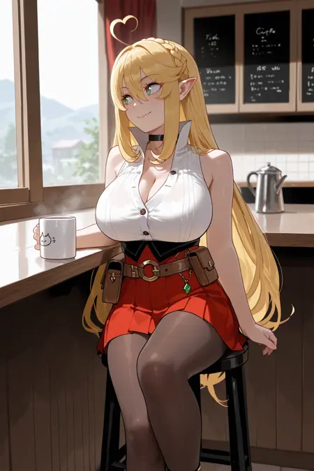 트리거 캐주얼: 엘도라, 긴 머리, 아호게, 왕관 땋기, 눈 사이의 머리카락, 금발, 뾰족한 귀, 녹색 눈, 송곳니, 날카로운 이빨, 검은 목걸이, 높은 칼라, 가슴 돌출, 흰색 블라우스, 단추, 소매 없음, 검은 코르셋, 벨트, 벨트 주머니, 빨간 치마, 주름치마, 갈색 팬티스타킹, 검은 발목줄, 하이힐