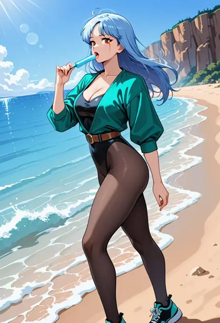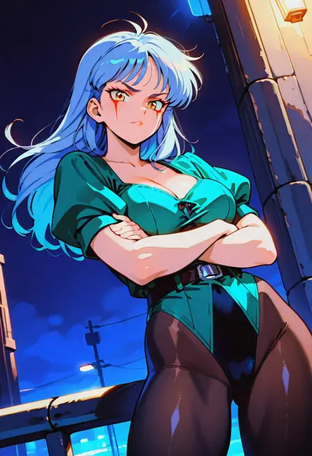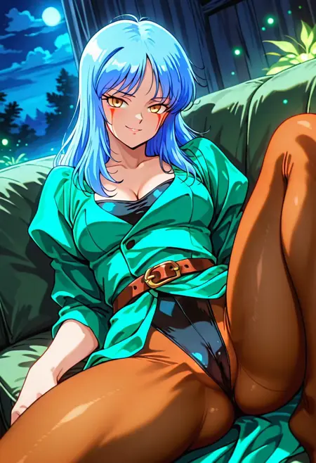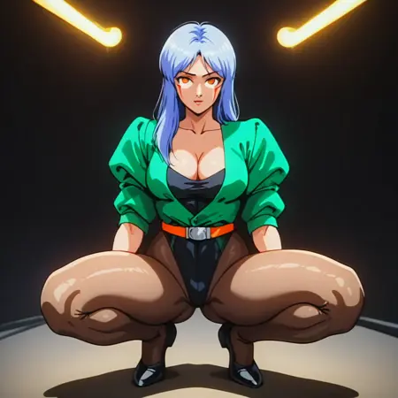 DiraHTD, 1个女孩, 单人, 蓝色头发, 长发, 刘海, 棕色眼睛, 面部标记, 嘴唇, 绿色夹克, 黑色紧身衣, 大乳房, 乳房显露, 厚大腿, 连裤袜, 鞋子, 蓬松袖子, 腰带, 高开腿, 锁骨,