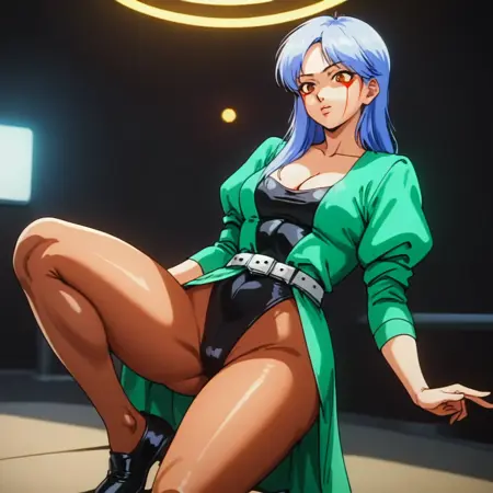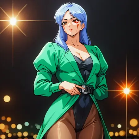 DiraHTD, 1소녀, 싱글, 파란 머리, 긴 머리, 앞머리, 갈색 눈, 얼굴 무늬, 입술, 녹색 재킷, 검은 레오파드, 큰 가슴, 가슴 사이, 두꺼운 허벅지, 팬티스타킹, 신발, 불룩한 소매, 벨트, 하이레그, 보조골