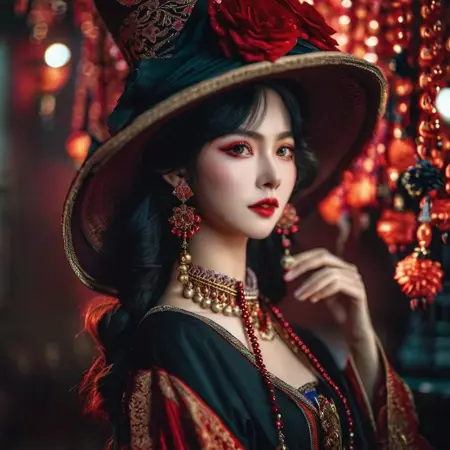 5. 1girl,solo,earrings,jewelry,hat,red eyes,mask,jack-o'-lantern,pointy ears,looking at viewer,long hair,witch hat,halloween,upper body,dress,pumpkin,white hair,black dress,breasts,black headwear,glowing,bangs,closed mouth,witch,thorns,black background,lips,medium breasts,fire,artist name,english text, halloweencoser
