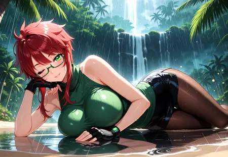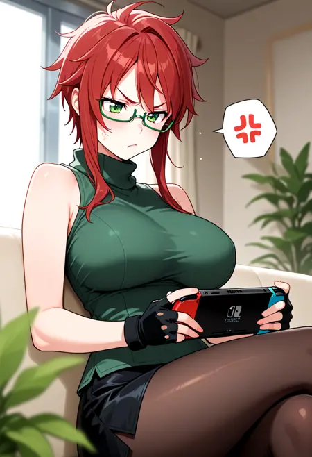 스즈코X, 녹색 눈, 단발, 어수선한 머리, 붉은 머리, 긴 측면 앞머리, 반프레임 안경, 큰 가슴, 하얀 피부, 진한 녹색 터틀넥, 소매 없는 터틀넥, 어깨 드러남, 꽉 끼는 녹색 셔츠, 검은 미니스커트, 검은 손가락 없는 장갑, 갈색 팬티스토크,