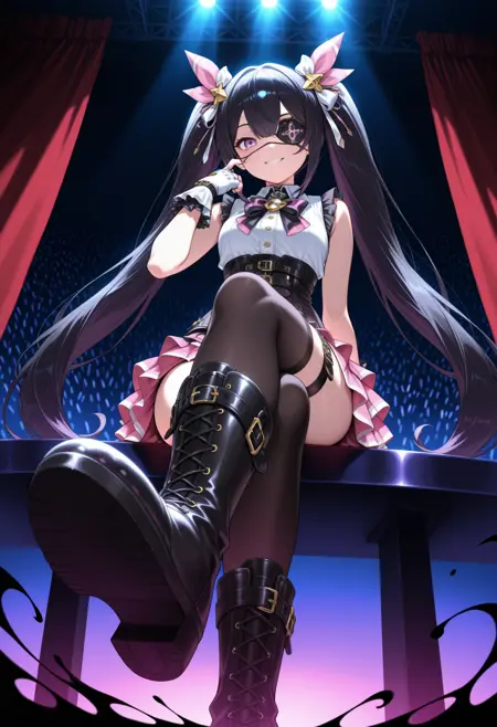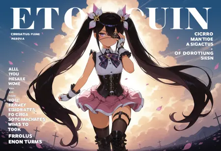 Optional clothing衣服:black belt boots,belt,one black thighhighs,bowtie,corset,cross-laced footwear,white gloves,fingerless gloves,hair ornament,hair ribbon,jewelry,pink skirt,ribbon,sleeveless skirt,thigh strap,
