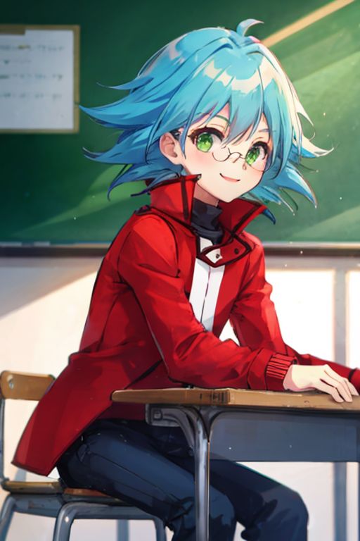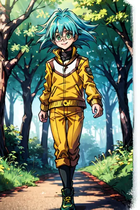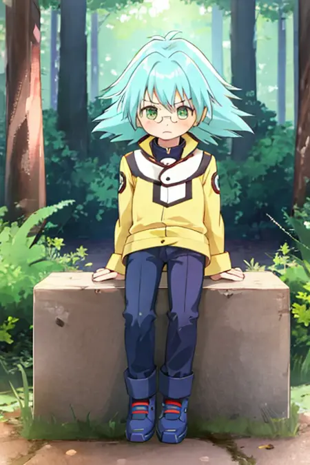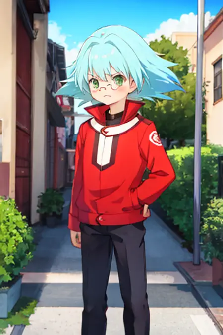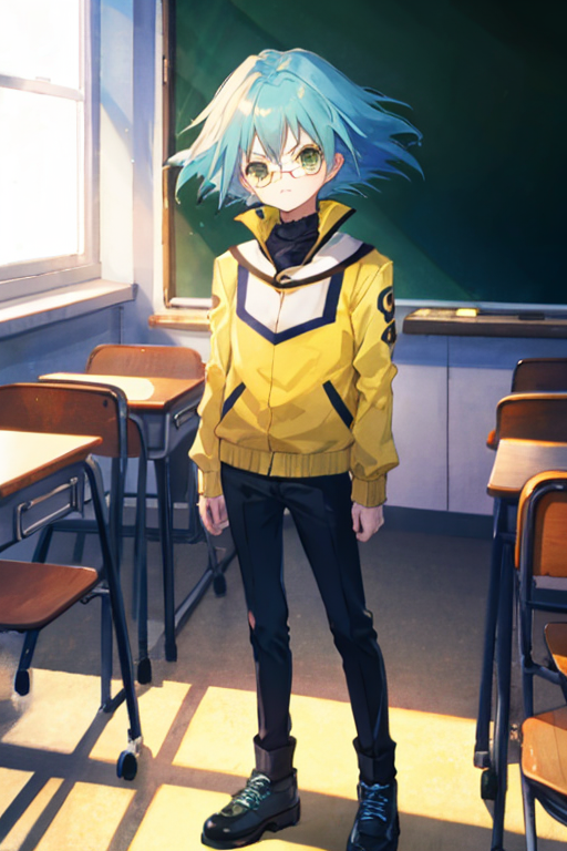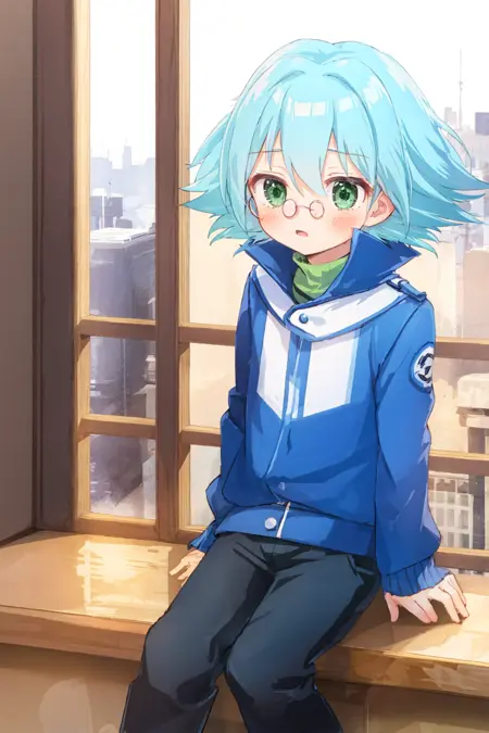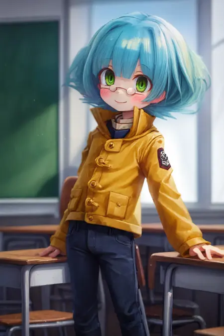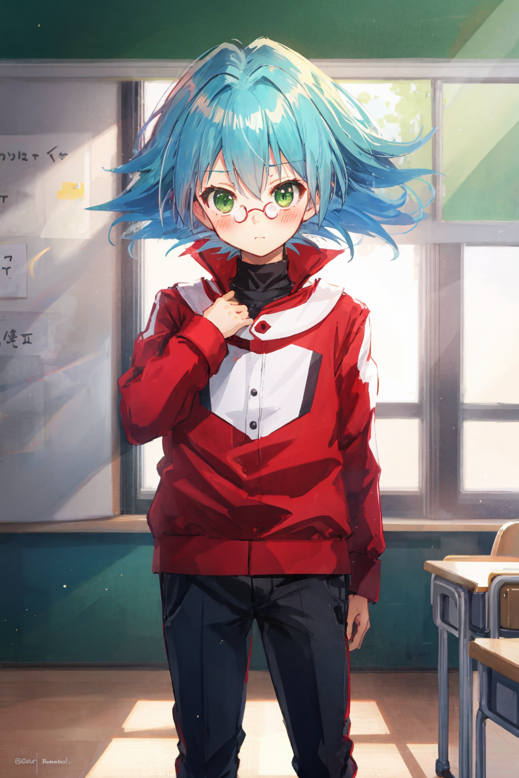 그를 불러내려면 **1boy, child, marufujisho**를 사용하세요 (첫 번째 두 키워드는 AI가 소년을 생성하도록 안내하기 위함입니다). 그의 외모를 불러내려면 **파란 머리, 짧은 머리, 앞머리, 녹색 눈, 원형 안경, 바지**를 사용하세요. 각 기숙사의 재킷을 입히려면 빨간 재킷 또는 노란 재킷 또는 파란 재킷 중 하나를 사용하세요 (각각 오지리스 레드, 라 노랑, 오벨리스크 파랑).