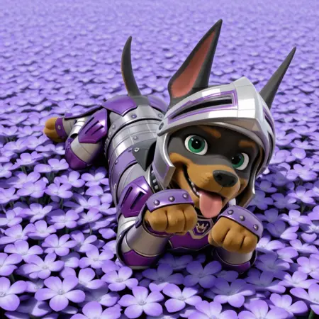 Doberman, black and brown fur, green eyes, pointed dog ears, black nose, dog tail, silver and purple armor, full armor, silver knight helmet,