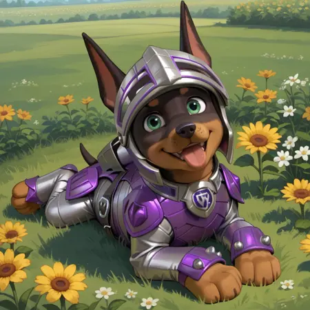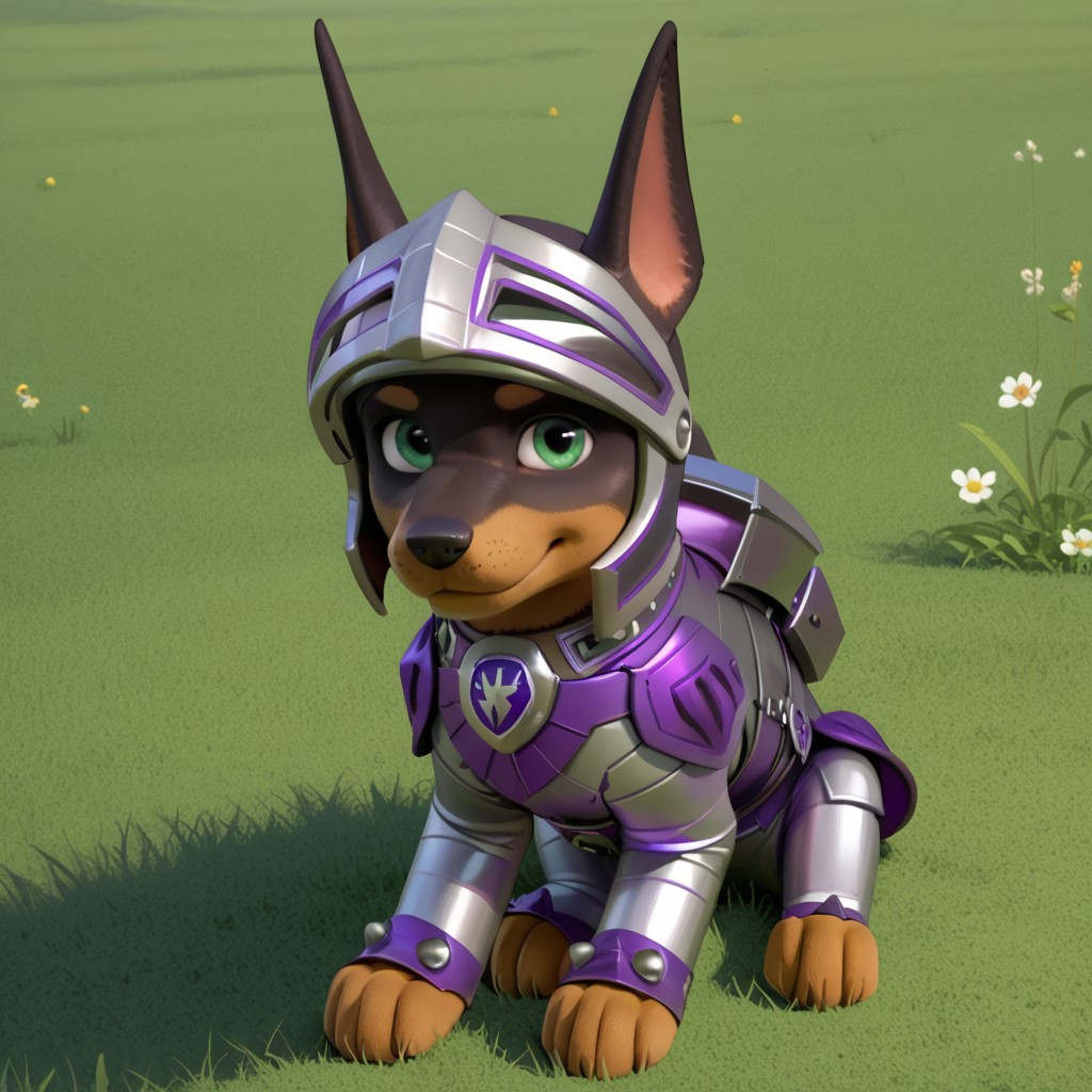 Doberman, black and brown fur, green eyes, pointed dog ears, black nose, dog tail, silver and purple armor, full armor, silver knight helmet,