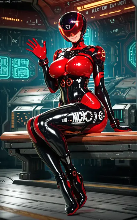 black and red helmet, black and red bodysuit, black corset