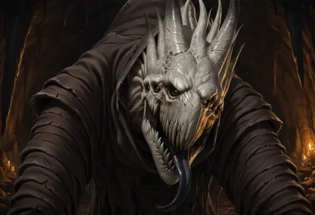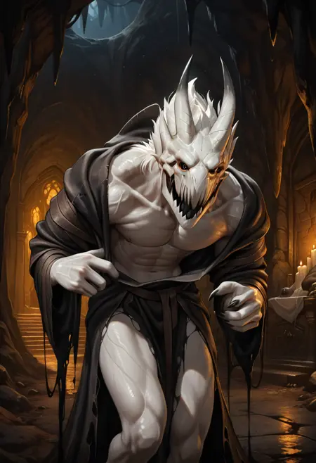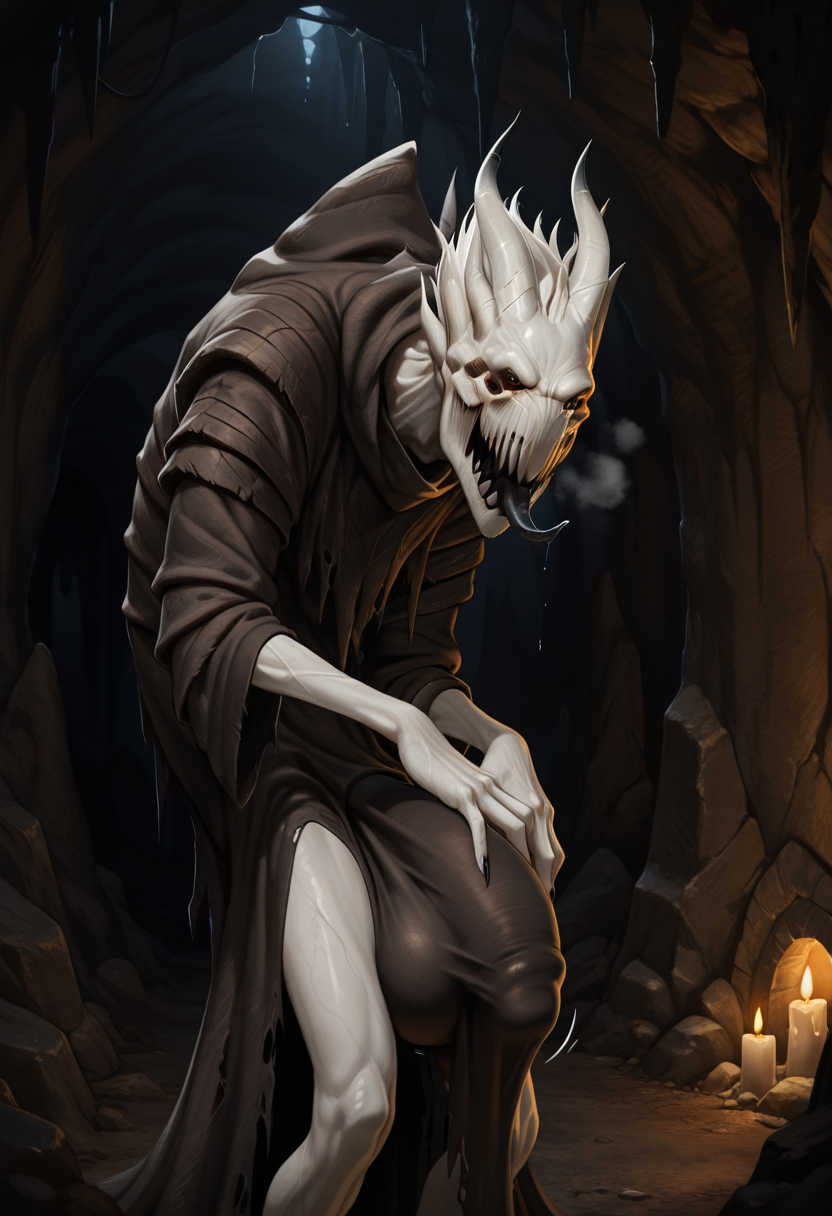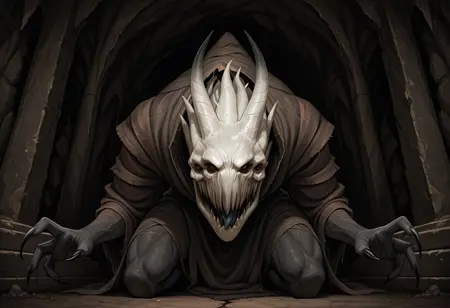 태그: 괴물, 여러 개의 눈, 창백한 피부, 찢어진 옷, 인간 없음, 날카로운 입, 발톱, 굽은 자세, 뿔 달린 머리