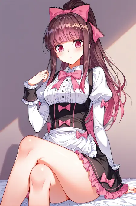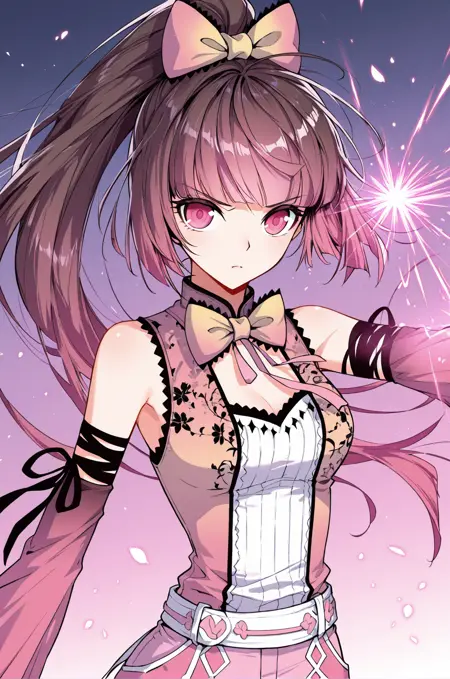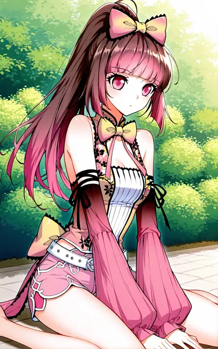Tang2, 1 girl, solo, pink eyes, long hair, reddish brown hair, pink tips, high ponytail, hair bow, blunt bangs, hair ornament, pink bow,