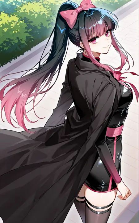 Tang3, 1 girl, solo, long hair, black hair, pink hair tips, gradient hair, straight hair, high ponytail, blunt bangs, pink eyes, large hair bow, pink bow,