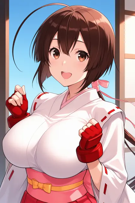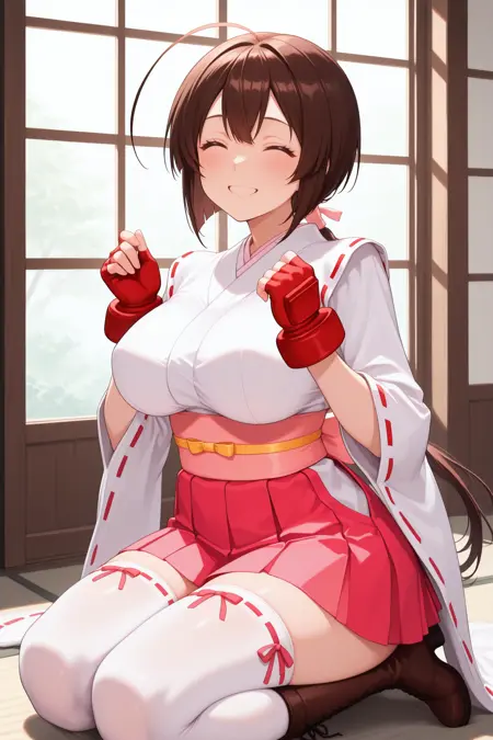 Add "white kimono, wide sleeves, pink sash, red skirt, hakama short skirt, red gloves, fingerless gloves, ribbon trim, white thighhighs, brown boots, lace-up boots" for her regular look.