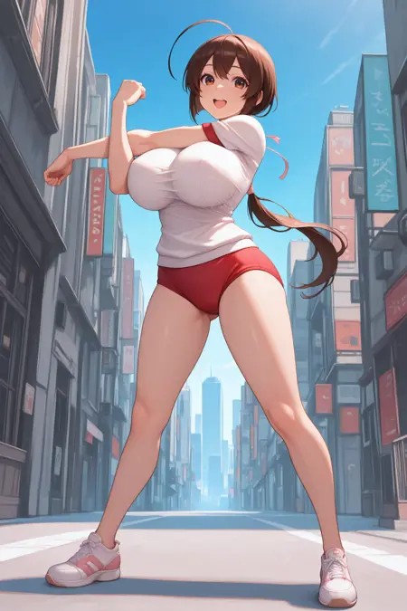 Add "white t-shirt, red buruma, sneakers" for her sportswear.
