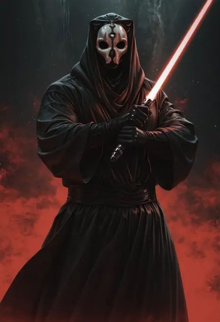Tags: humanoid, black robes, mask, hood, cloak, red lightsaber